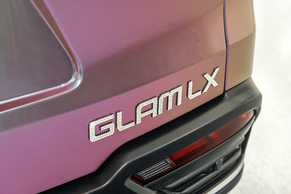 Built in collaboration with the elite team at Complete Customs, the Glam LX shines in a pearl symphony chameleon wrap with crystal-faceted badging and a stitched pink and white leather interior featuring luxe touches like plush mohair, silk and stone inlay accents.