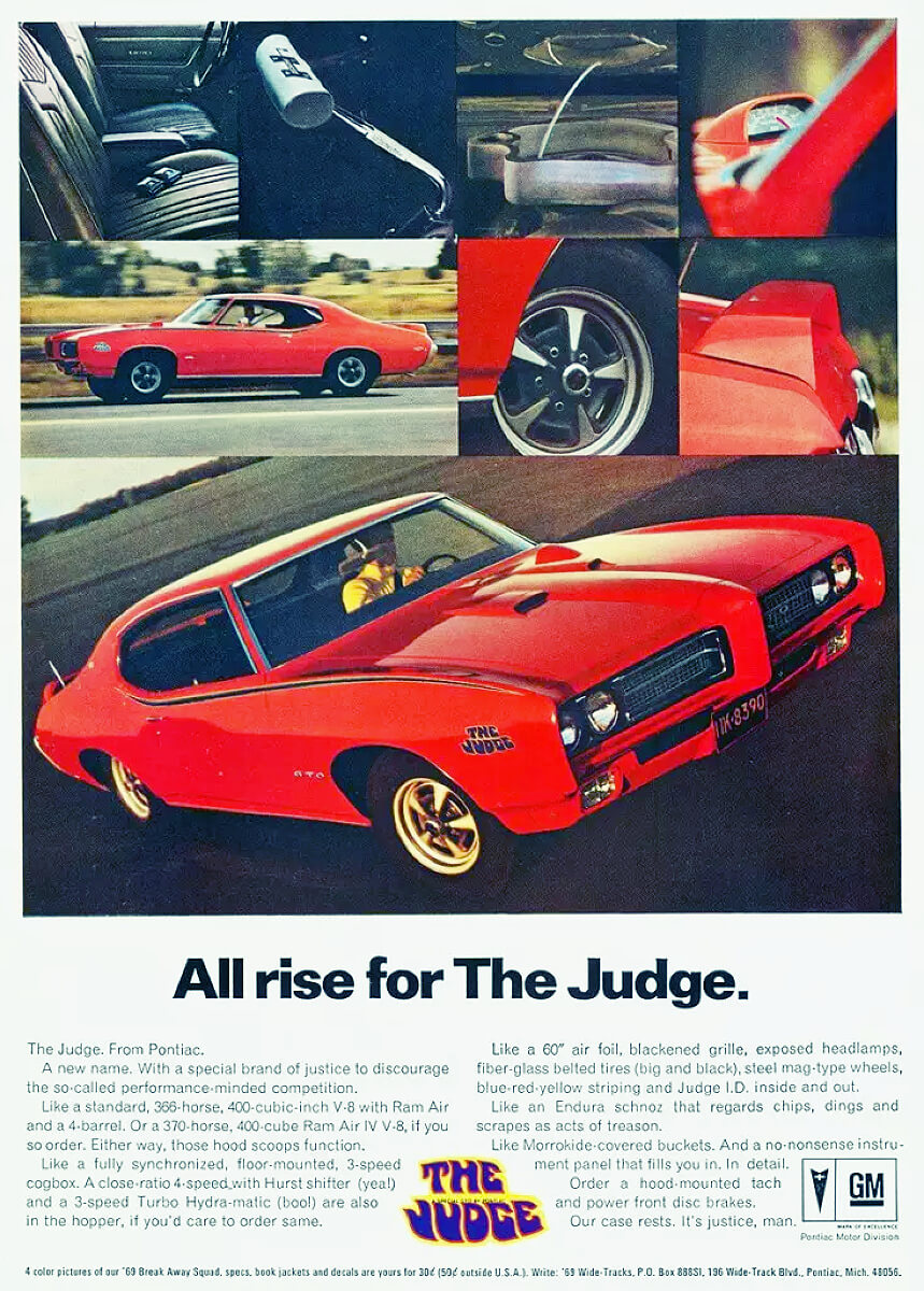 By 1970, the peak performance year for muscle cars, sales were impacted by rising insurance rates and impending smog rules, but before then, the Judge was at the head of the court.