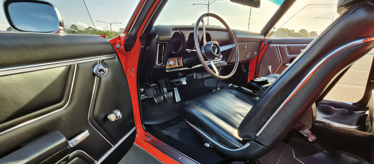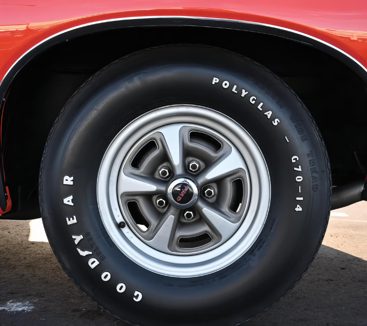 Pontiac 14 x 6 inch steel Rally II wheels with chrome lug nuts were standard, but trim rings were not. Goodyear’s Polyglas-belted tyres were common muscle car fixtures in the late 1960s, and G70-14 blackwall tyres were standard on the Judge. Kevin’s Judge has white-letter tires, a personal preference.