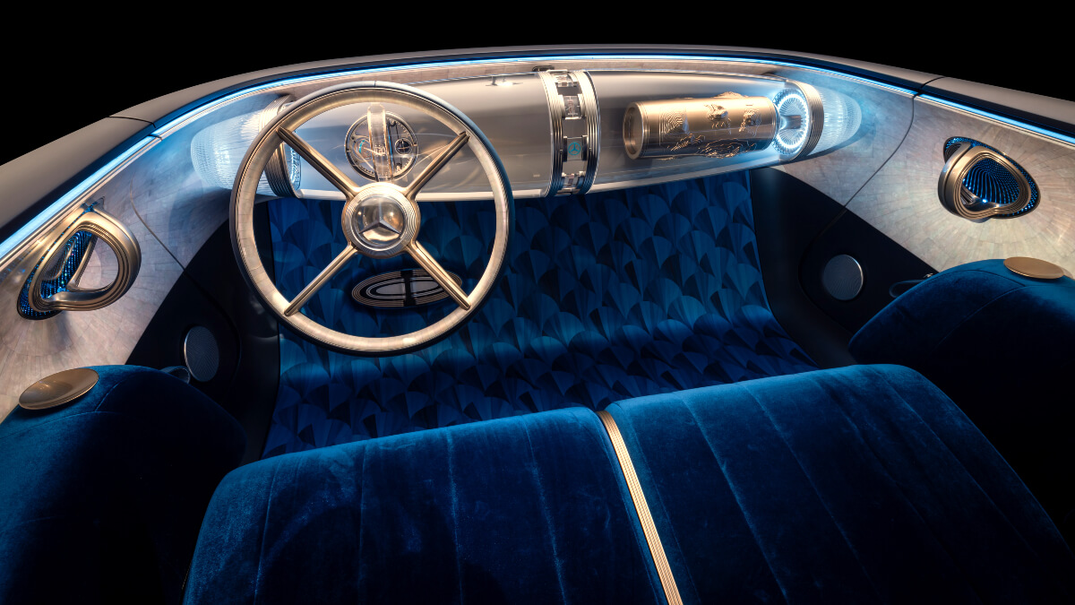 The interior of Vision Iconic redefines automotive elegance through an opulent Art Deco-inspired composition of finest craftsmanship and exclusive materials.