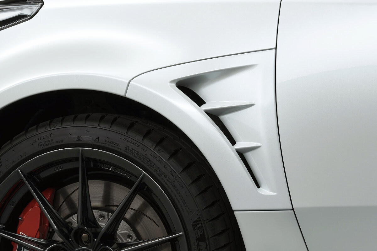 Front fender ducts located between the front wheels and doors help expel accumulated rearward air from the wheelhouse to improve steering feel under heavy braking while also making the car more stable when entering corners.