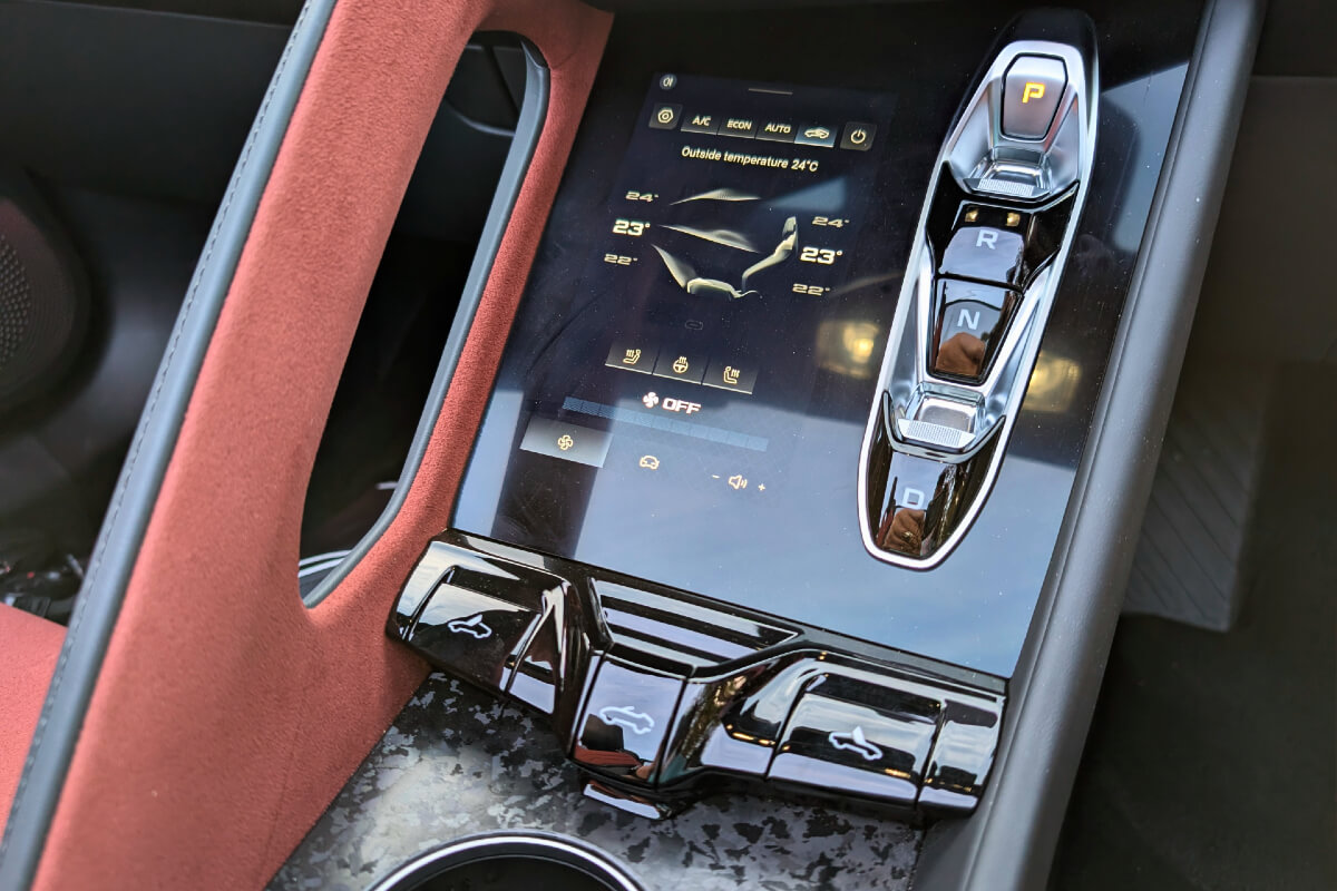 The red button on the right selects drive mode: Comfort, Sport, or Custom, or Super Sport. Comfort mode is fine and the one in which we spent most time. Be careful with the latter.
