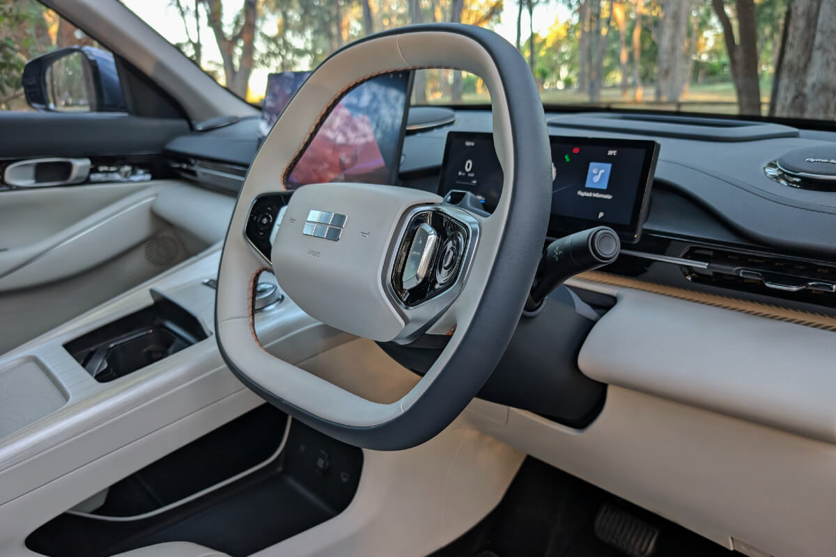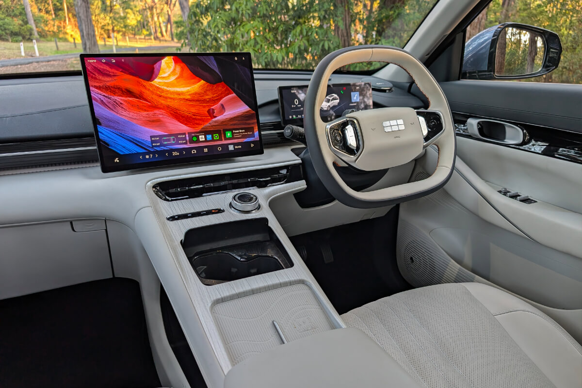 A 15.4-inch touchscreen fronts the infotainment system which runs Geely’s Flyme operating system, with Bluetooth, voice control, built-in satellite navigation, FM and DAB+ digital radio, wireless Apple CarPlay and six-speaker sound.